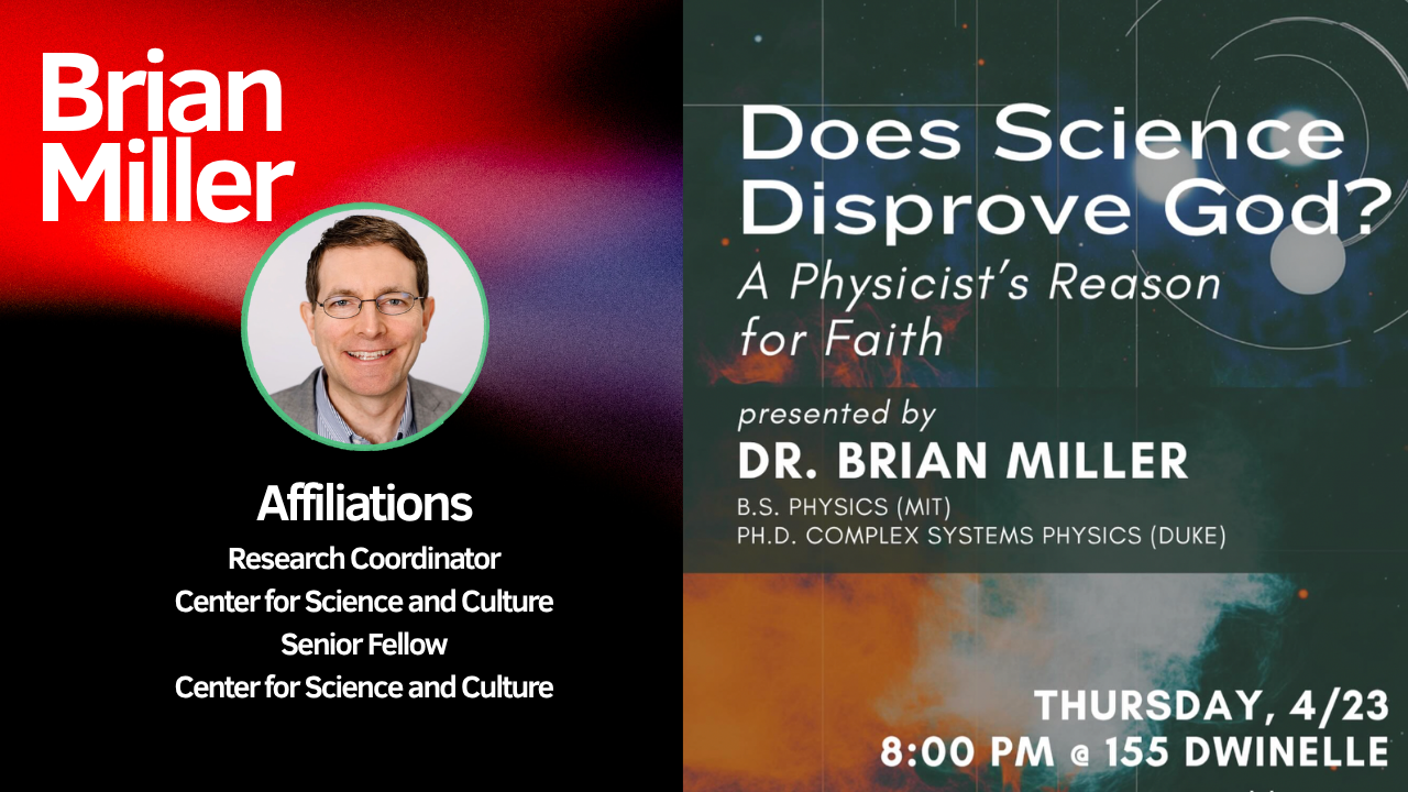 We’re so excited being invited to join a *one-night-only* seminar, “Does Science Disprove God?” given by Dr. Brian Miller. Come join us as we cover topics ranging from how physics backs the existence of a Creator to how the newest data fits into his faith. Now’s your chance to ask tough questions and engage in deeper discussion - no matter your background or belief!